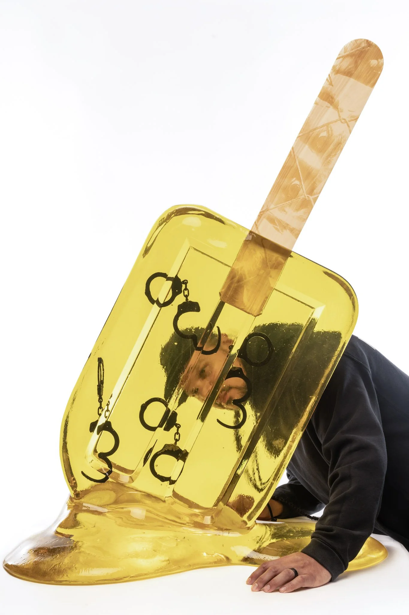 Marka27’s I.C.E. Scream series is a visual protest turning something as familiar as a paleta into a powerful symbol of systemic oppression. At first glance, the brightly colored frozen treats evoke nostalgia, but a closer look reveals a chilling reality. Made from resin as well as acrylic, these paletas contain etched images and encapsulated objects ranging from handcuffs to flowers and rosaries—celebrating the strength and resilience of indigenous communities while representing the struggles of immigrant families caught in the U.S. immigration system.